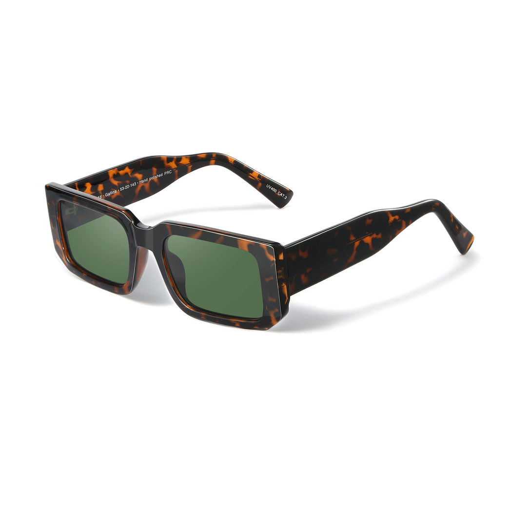 Gallina Havana solglasögon har en markerad båge i klassiskt havanamönster tillsammans med gröna linser, vilket ger ett uttryck som är både tidlöst och självsäkert. Den rektangulära formen och det karakteristiska mönstret gör modellen till ett tydligt stilval för dig som vill sticka ut utan att det känns överdrivet.