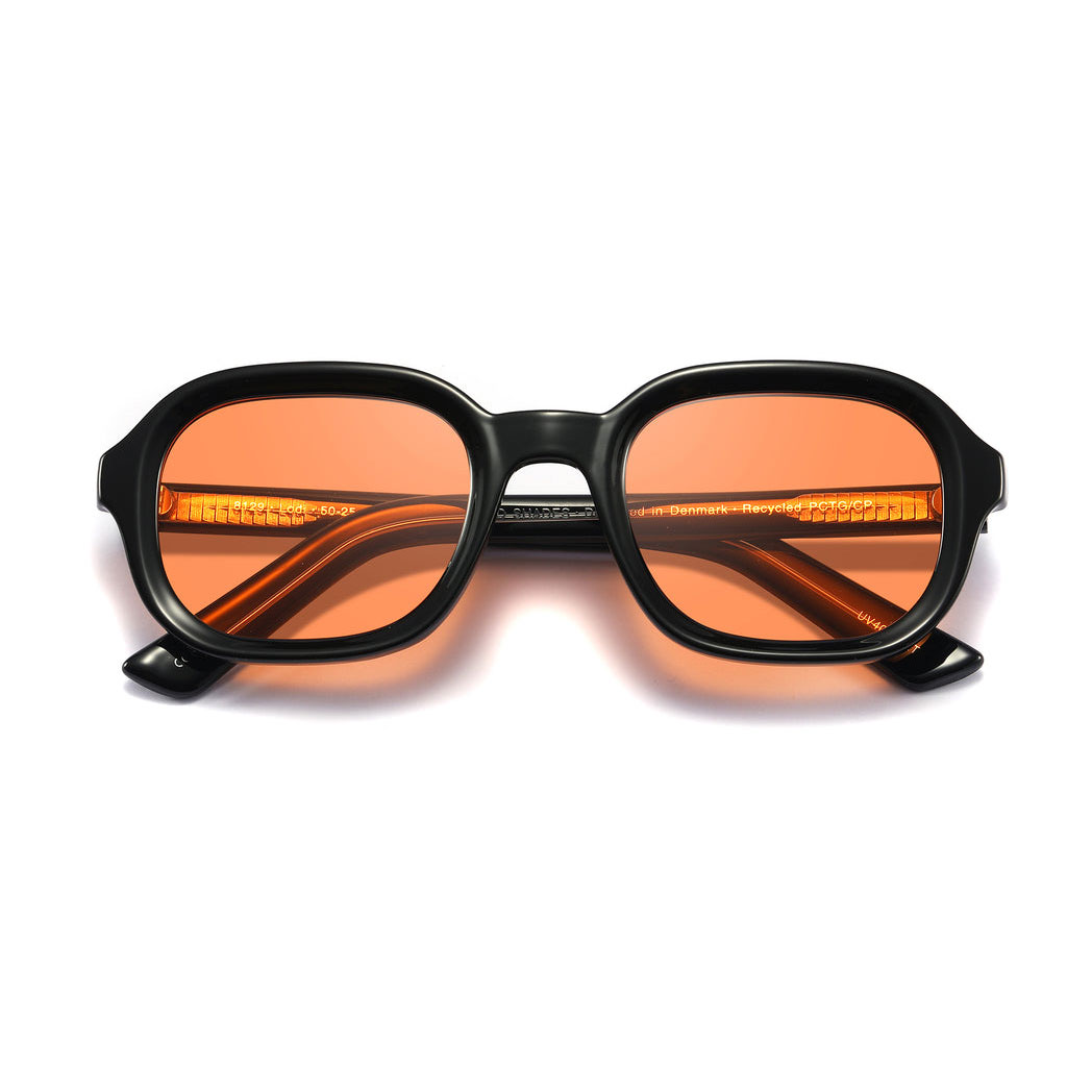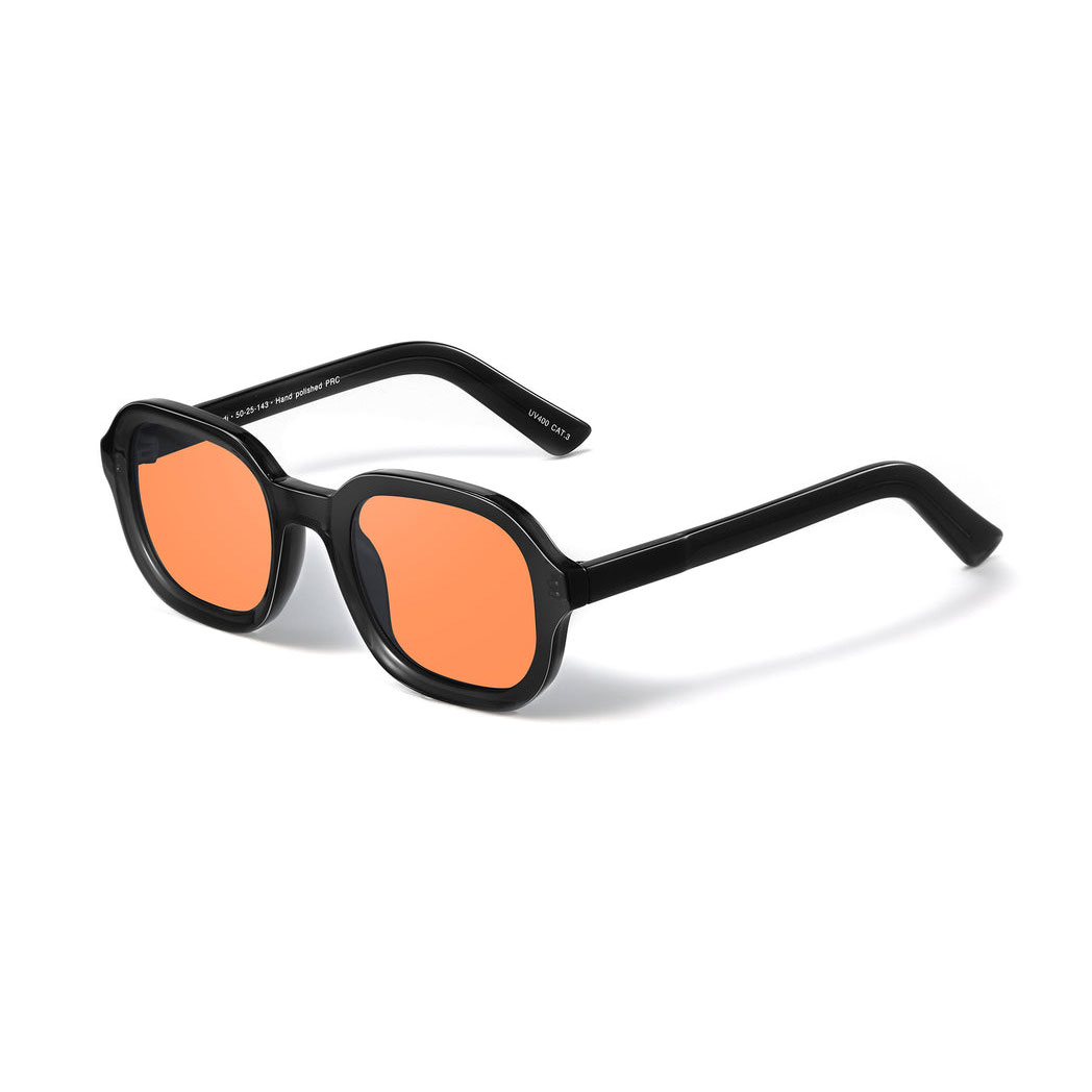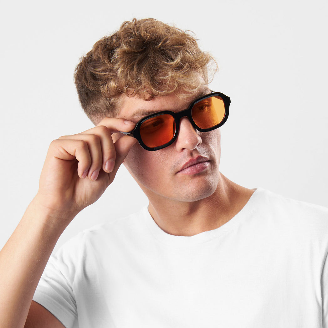 Lodi Orange solglasögon kombinerar en djärv svart båge med orangefärgade linser och skapar ett uttryck som balanserar modern känsla med en lekfull retroton. Den fyrkantiga formen ger ett självsäkert intryck och gör modellen till ett tydligt val för dig som gillar att synas.