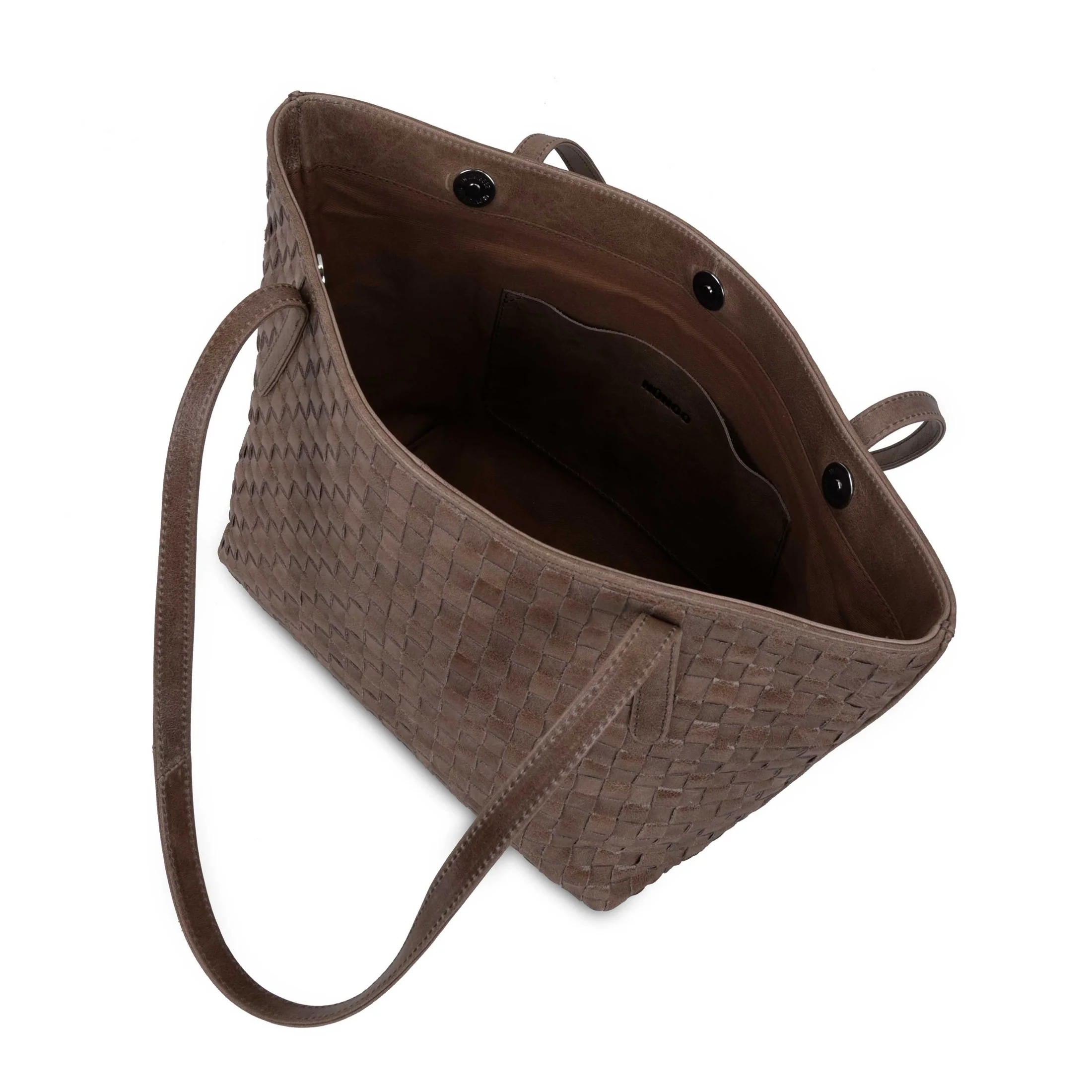 Denna shopper har en flätad design med axelremmar. Väskan består av ett stort fack och en innerficka. Väskan stängs med magnetknappar.