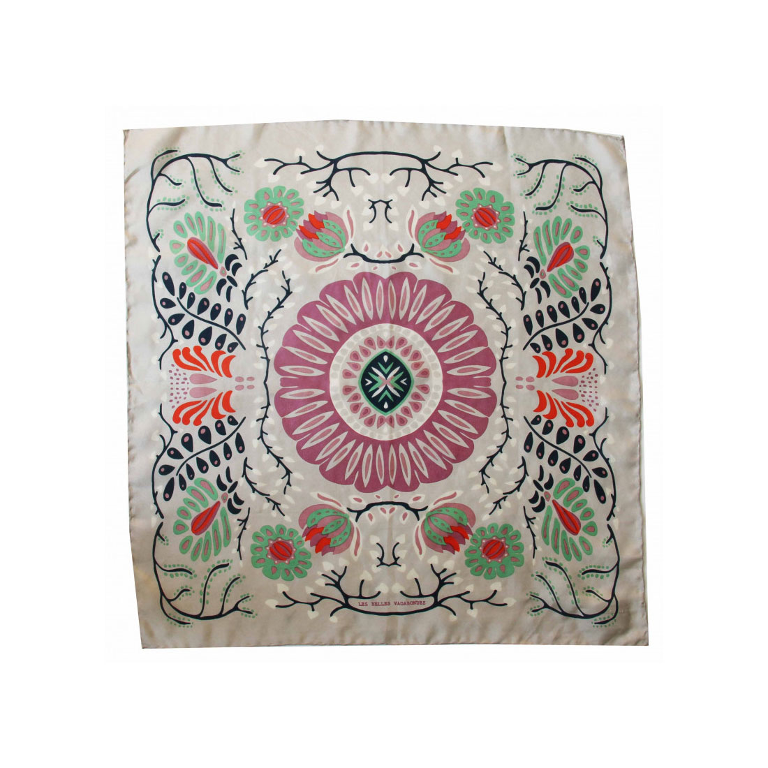 En mjuk sidenscarf med konstnärligt mönster och vacker färgskala. Handtryckt i Indien vilket ger varje scarf en unik känsla. Fin både till vardag och fest.