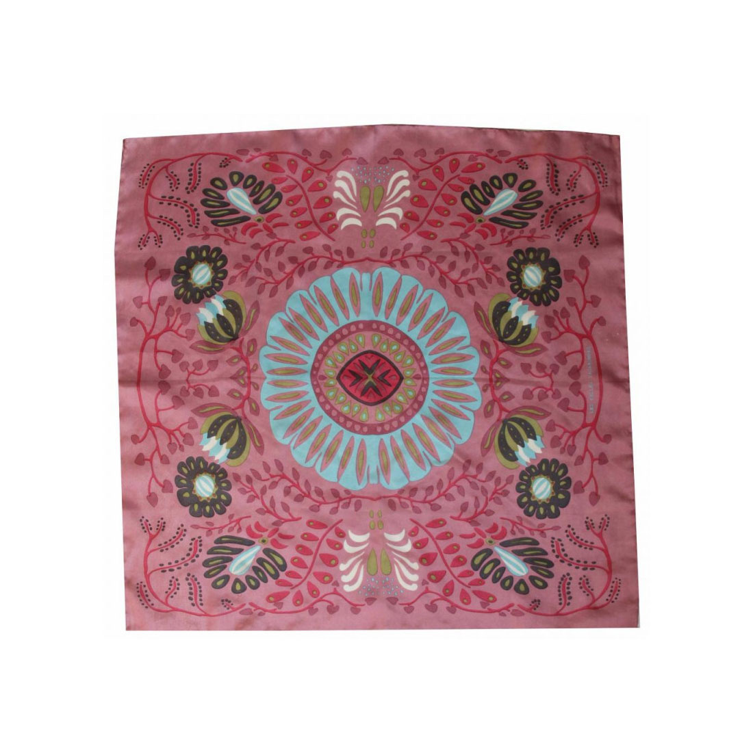 En färgstark sidenscarf med handritet mönster och ett levande uttryck.