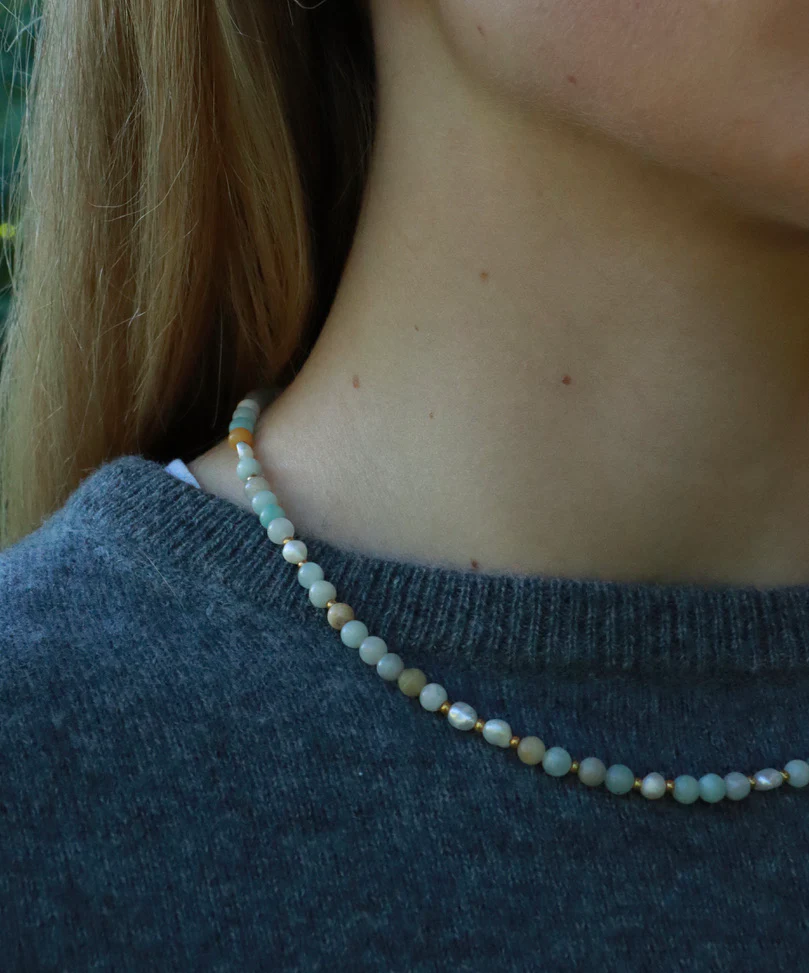 Ellie Amazonitpärlhalsband är utformat för att hjälpa dig att hitta hopp, framgång och lugn. Denna kristall sägs öppna ditt hjärta och stärka dina kontakter med andra. Dess blå och gröna nyanser symboliserar lugn och harmoni, medan stenen i sig står för sanning och mod. Tillverkat med omsorg och noggrannhet i detaljerna är detta halsband inte bara ett smycke, utan också en påminnelse om din inre styrka.