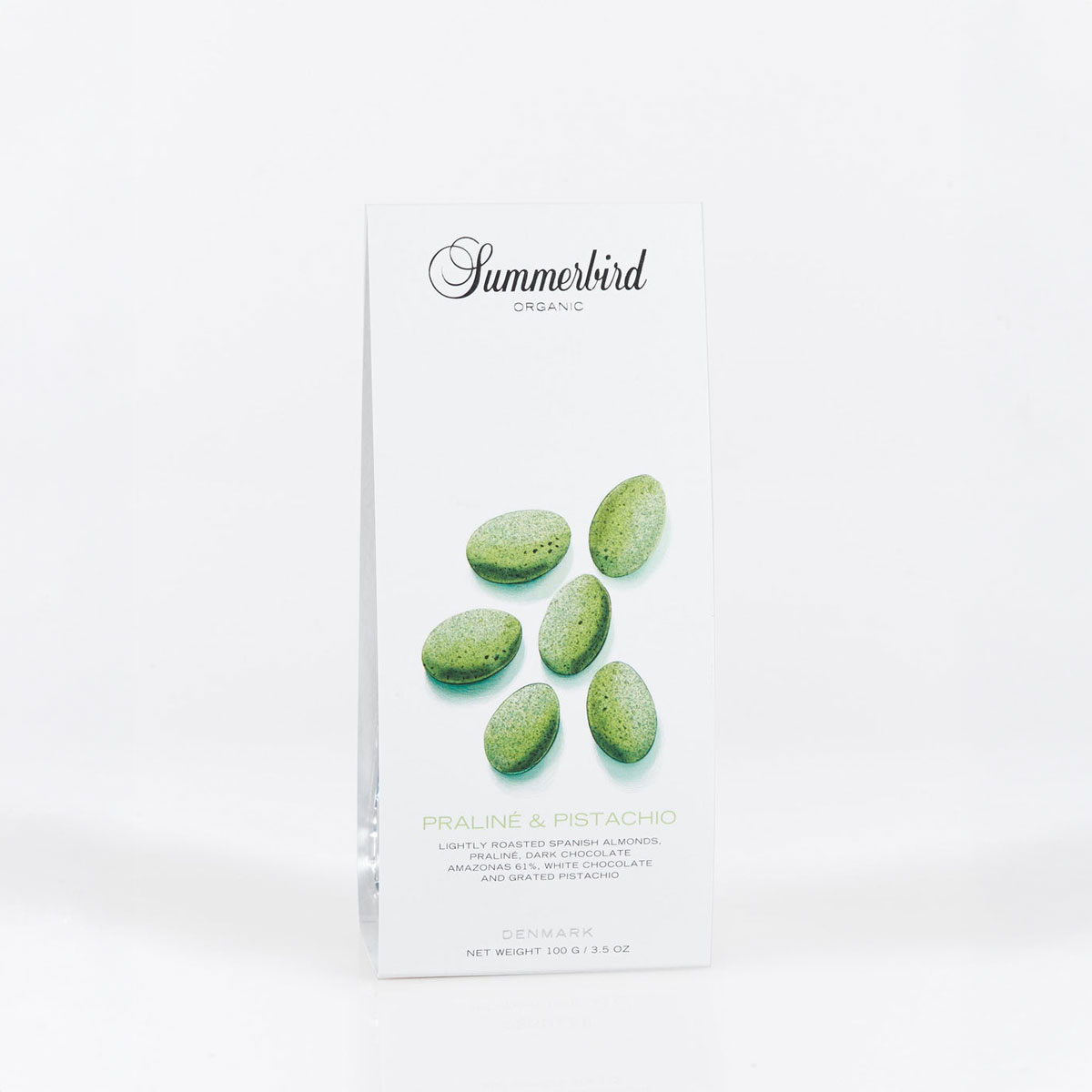 Ingredienser:MANDLAR (34 %), *socker, *kakaomassa (16 %), *MJÖLKPULVER (10 %), *HASSELNÖTTER (5 %), *kakaosmör (4 %), *PISTAGENÖTTER (4 %), *rörsocker, *SMÖR, *vanilj, emulgeringsmedel (*SOJALECITIN), *spenatpulver, vatten, *maltodextrin, Maldon havssalt, *passionsfruktspulver, *blodapelsinolja, *apelsinblomsvatten.