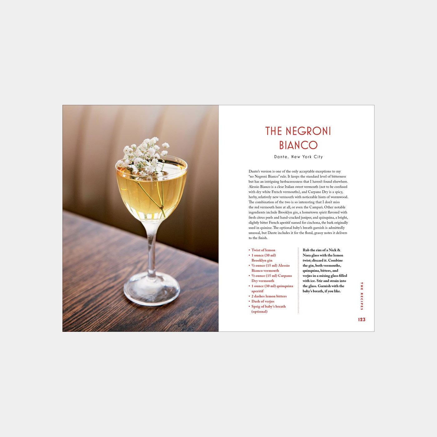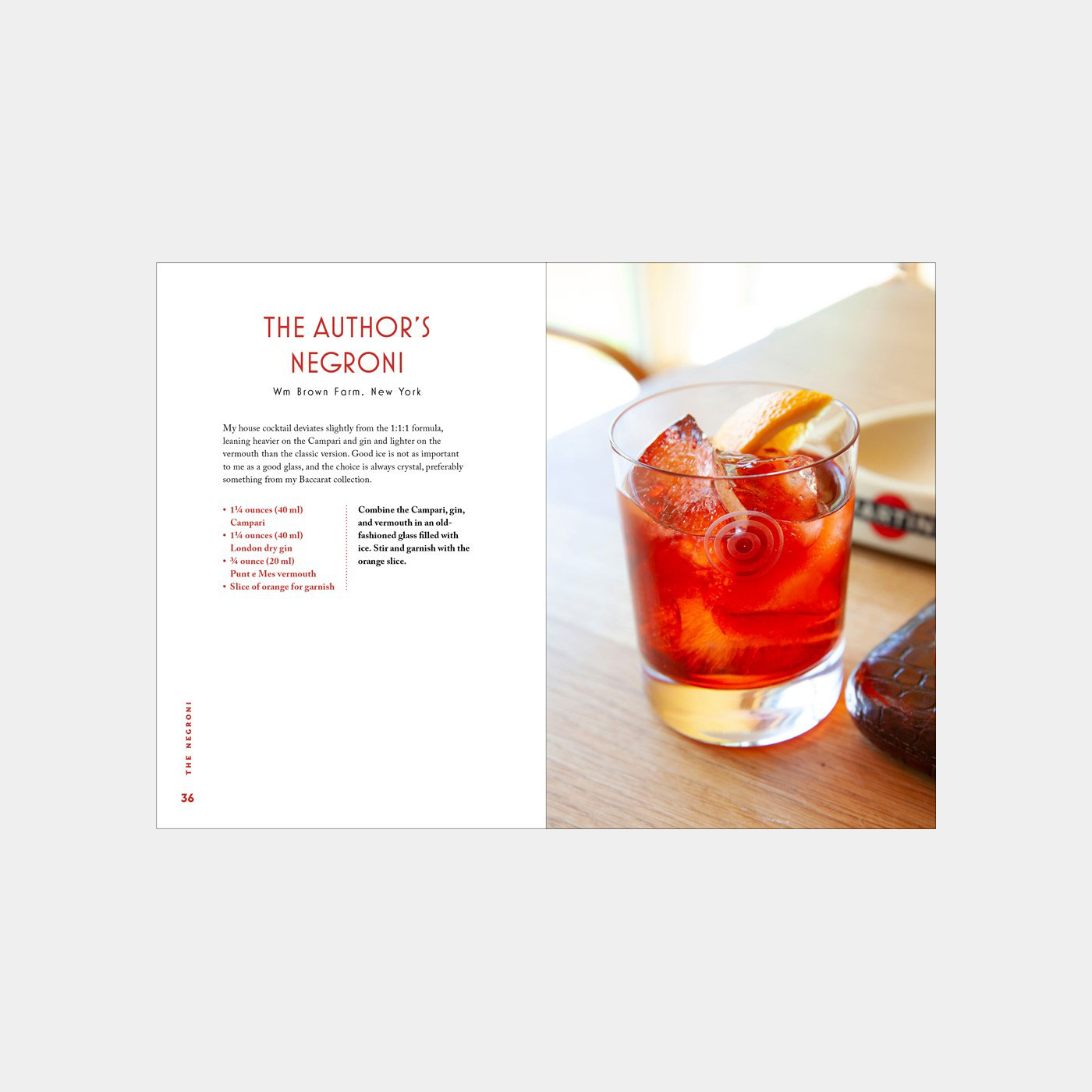The Negroni ger läsaren inblick i drinkens ursprung i Italien – där den började som en variation på Americano – och verktygen för att skapa över 20 enkla varianter, framtagna av dryckesexperter och bartenders från hela världen. Här finns bland annat Negroni Frappé från den legendariska baren Dante i New York, Negroni Sbagliato från Bar Basso i Milano där gin ersätts med prosecco, samt författarens egen version med mer gin och mindre vermouth.