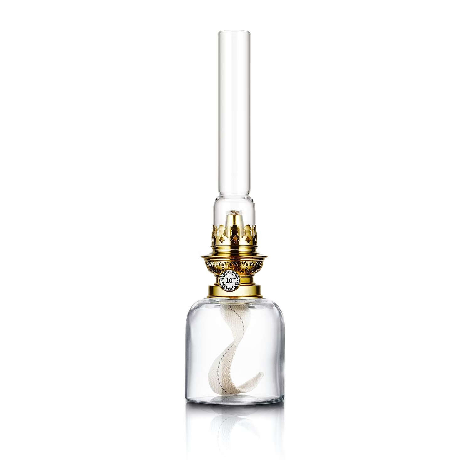 En klassisk fotogenlampa från Karlskrona Lampfabrik, med anor från sent 1800-tal. Skeppsholmen har samma tidlösa design som Koholmen, men med ett större oljehus i munblåst klarglas som finns i flera vackra färger. Den blanka mässingsbrännaren – eller förnicklad mässing i varianten med rökfärgat glas – ger lampan ett elegant uttryck.