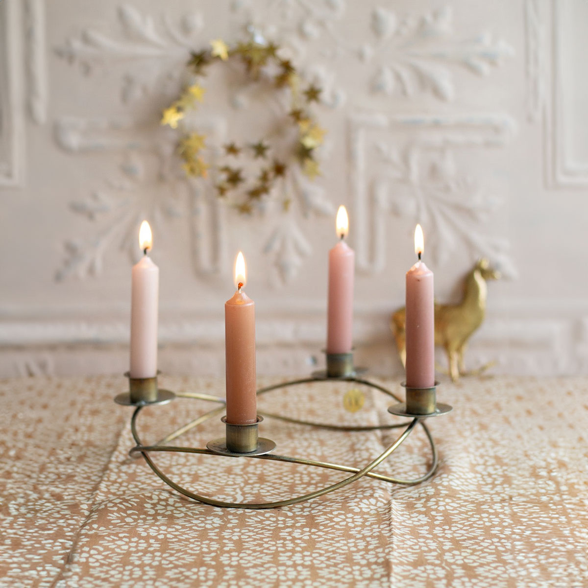 Elegant ljusstake i metall med varm mässington och plats för fyra ljus. Den runda formen ger ett modernt och harmoniskt uttryck – vacker som adventsljusstake och fin att dekorera med några kvistar eller ett sidenband för extra julkänsla.