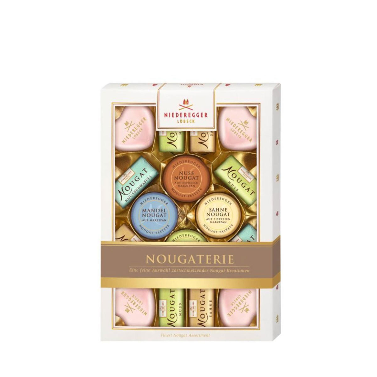 De bästa nougatbitarna från Niederegger samsas i denna fina presentförpackning. Upptäck den mjuka klassiska nougaten, den ljusa gräddnougaten, nougat i två lager eller nougat med krispiga bitar av cashewnötter.