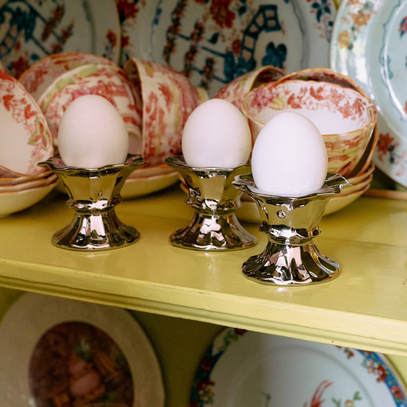 En tidlös bordsdetalj, omgjord. Denna uppsättning med fyra äggkoppar är tillverkade av keramik och har en djärv kromglasyr – klassisk i formen, modern i attityd. Minimalistiska, reflekterande och lite oväntade, de ger en polerad twist till ditt frukostbord.