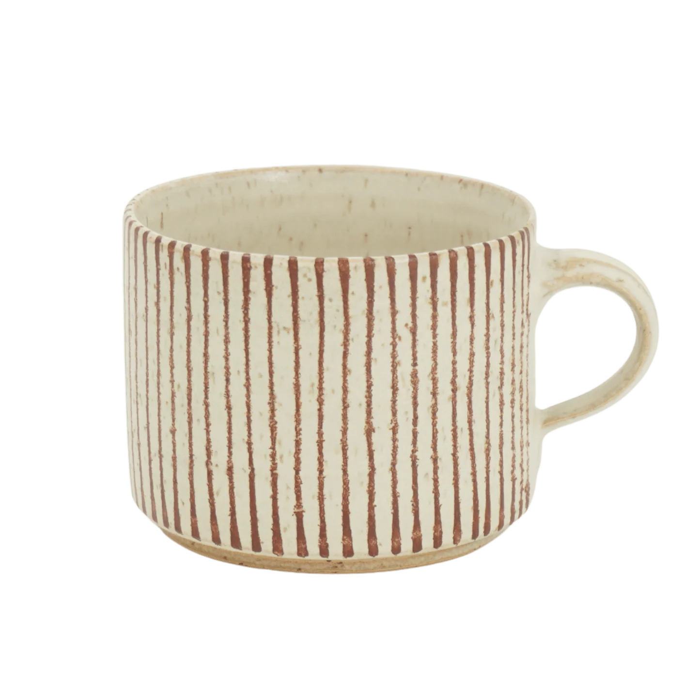 Njut av en varm kopp te i en större handgjord kopp från servisen Öland – en hyllning till den öländska naturen och hantverkets tradition. Den finrandiga designen med träbruna ränder på havrefärgad botten skapar en varm, grafisk känsla som passar i både moderna och klassiska hem.