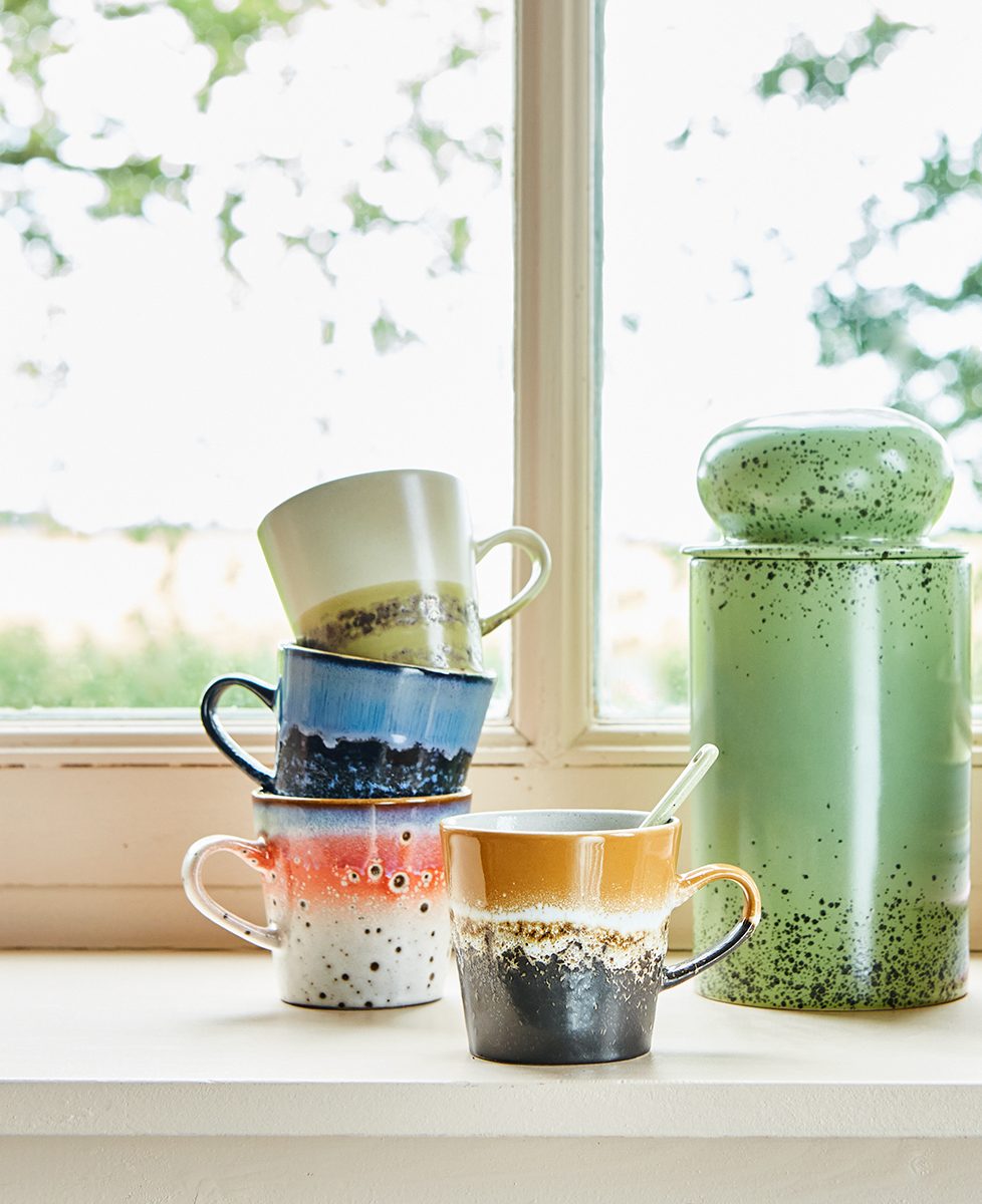 70’s serien från HK living är tillverkad i glaserad stengods med en retro design. Muggen finns i flera olika glasyrer och färger och är perfekt att mixa och matcha precis som du vill. Produkten är handtillverkad och variationer i färg, form och storlek kan därför förekomma. Tål maskindisk och mikrovågsugn. Koppen rymmer 27 cl