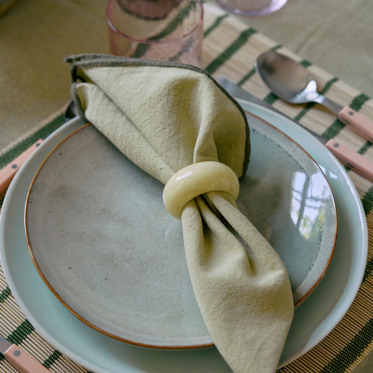 Detta set med fyra servettringar förvandlar det vardagliga till något skulpturalt. Varje ring har sin egen unika form och färg, vilket ger dukningen personlighet och en touch av samtida design. Lätta men eleganta – en liten detalj som gör stor visuell skillnad.