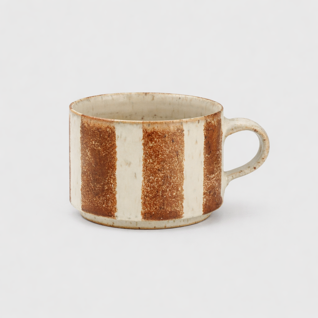 Paradisverkstadens keramikkoppar med handmålad glasyr. De breda linjerna skapar en iögonfallande kontrast mot kopparnas havrefärgade botten.