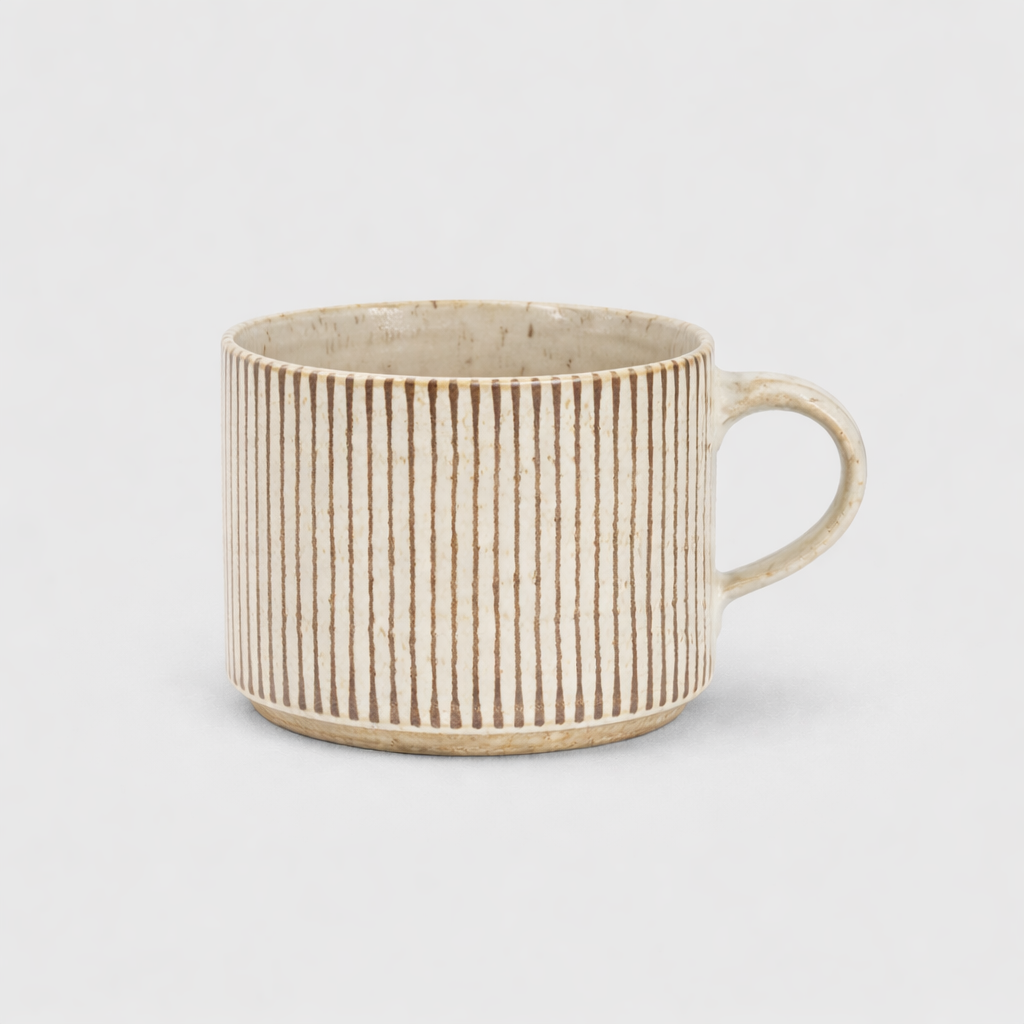 Paradisverkstadens keramikkoppar med handmålad glasyr. Linjerna skapar kontrast mot kopparnas havrefärgade botten.