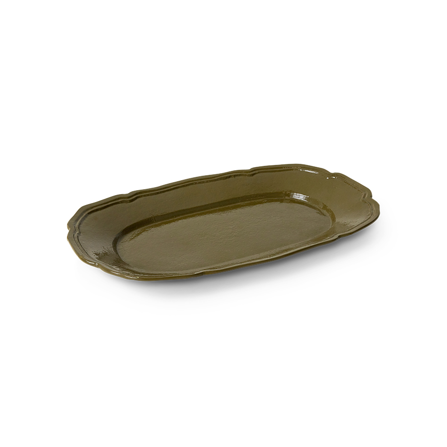 En stilren serveringsbricka i olivgrön ton som kombinerar klassisk form med en modern känsla. Den släta, matta ytan och den mjukt rundade kanten ger ett lugnt men uttrycksfullt intryck – lika fin att servera på som att låta stå framme som en dekorativ detalj.
