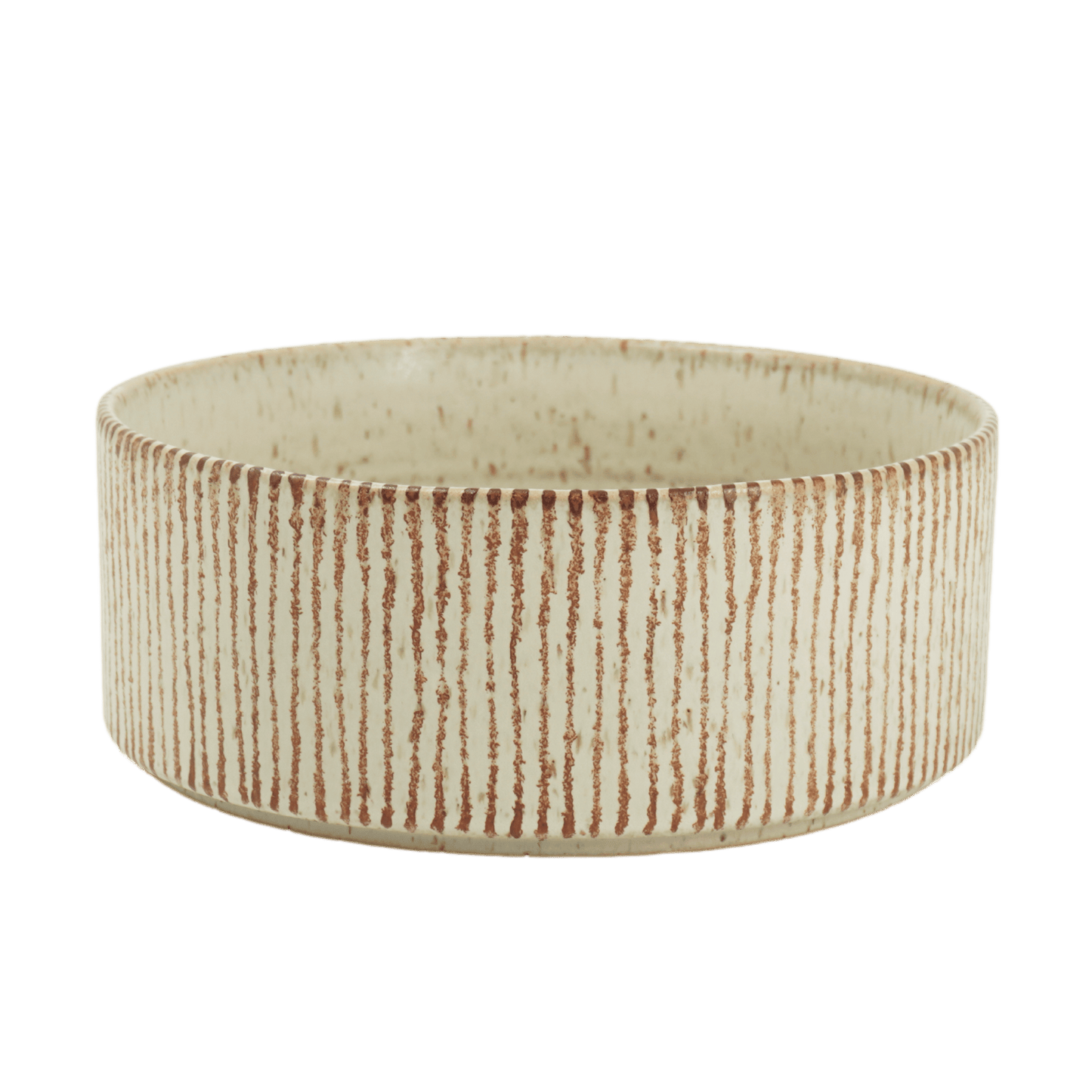 Större skål i serien Öland med handmålad glasyr i färg havre/brun. De bruna tunna ränderna skapar en vacker kontrast mot skålens havrefärgade botten.