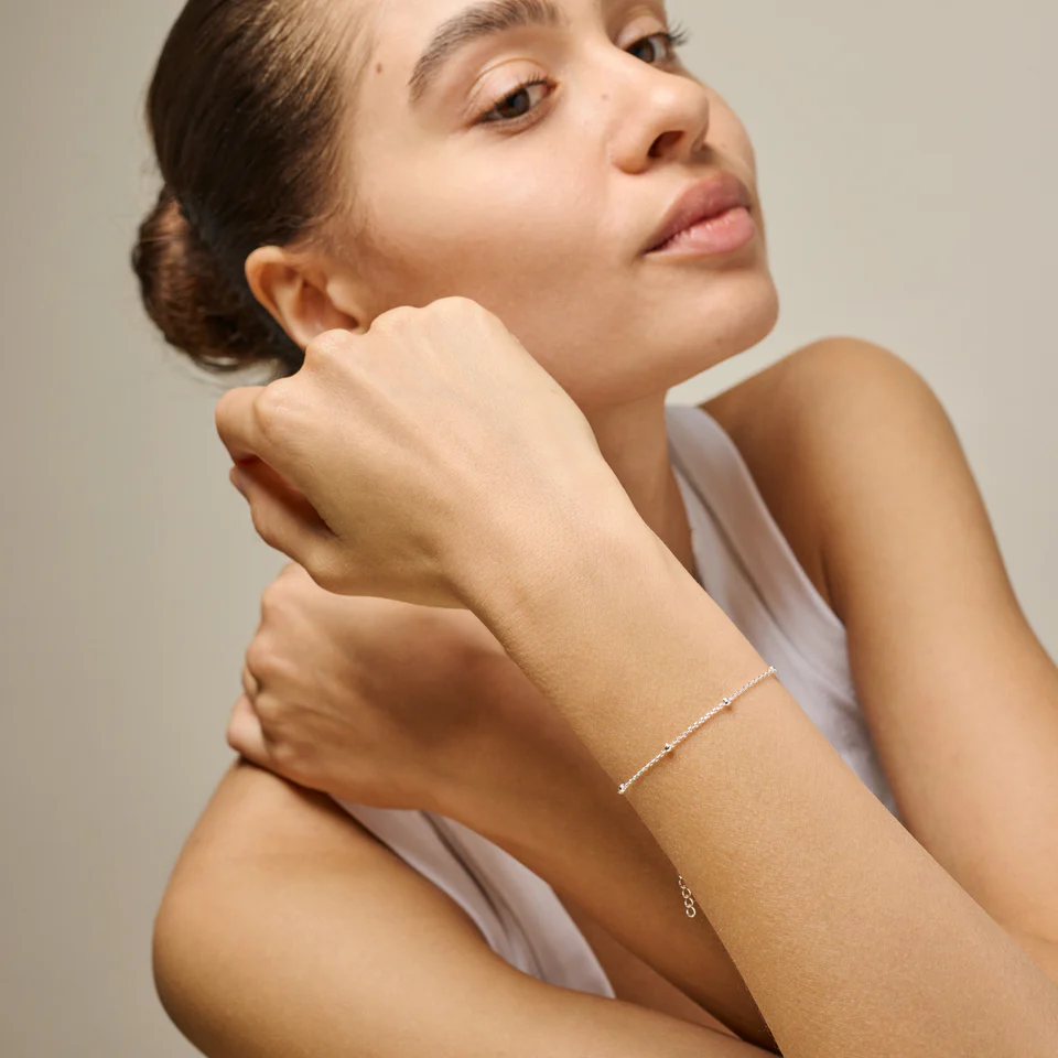 Beaded Chain Bracelet är ett enkelt och feminint armband med små, jämnt fördelade prickar längs en fin kedja. Den minimalistiska designen gör det enkelt att bära ensam, men även perfekt för en lager-på-lager-look. De små prickarna ger armbandet en diskret lek och en elegant rytm. Finns även som halsband, samt i guld.