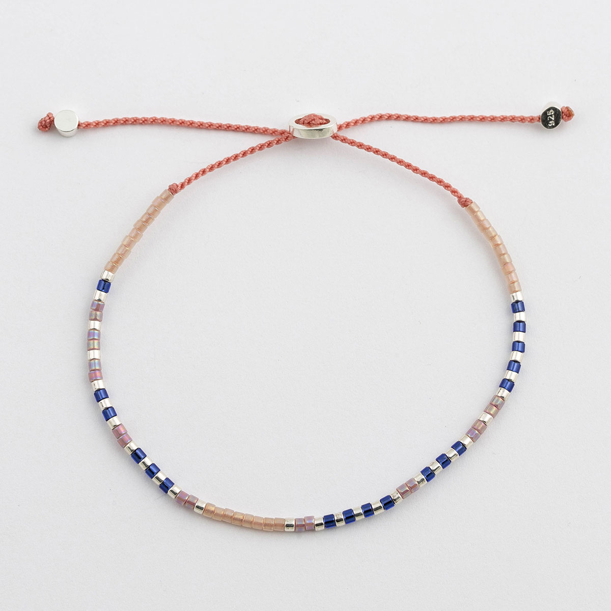 Tunt trådarmband med japanska glaspärlor och ändpärlor och knäppe i sterling silver. Pärlorna kombineras enligt ett visst mönster och bildar en morsekod med budskapet ”JUST BREATHE”
