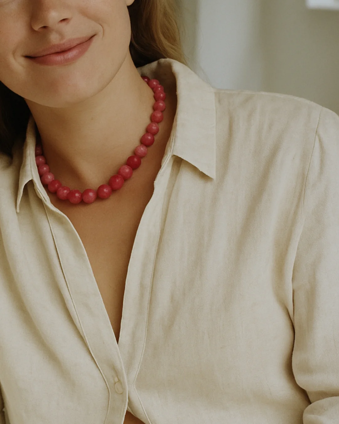 Faro Redstone Quartz kristallhalsband är utformat för att hjälpa dig att hitta klarhet, fokus och inre frid. Den strålande Redstone Quartz symboliserar klarhet, balans och mental styrka. Halsbandet är tillverkat med omsorg och precision och är mer än ett smycke; det är ett uttryck för rå styrka och uthållighet.