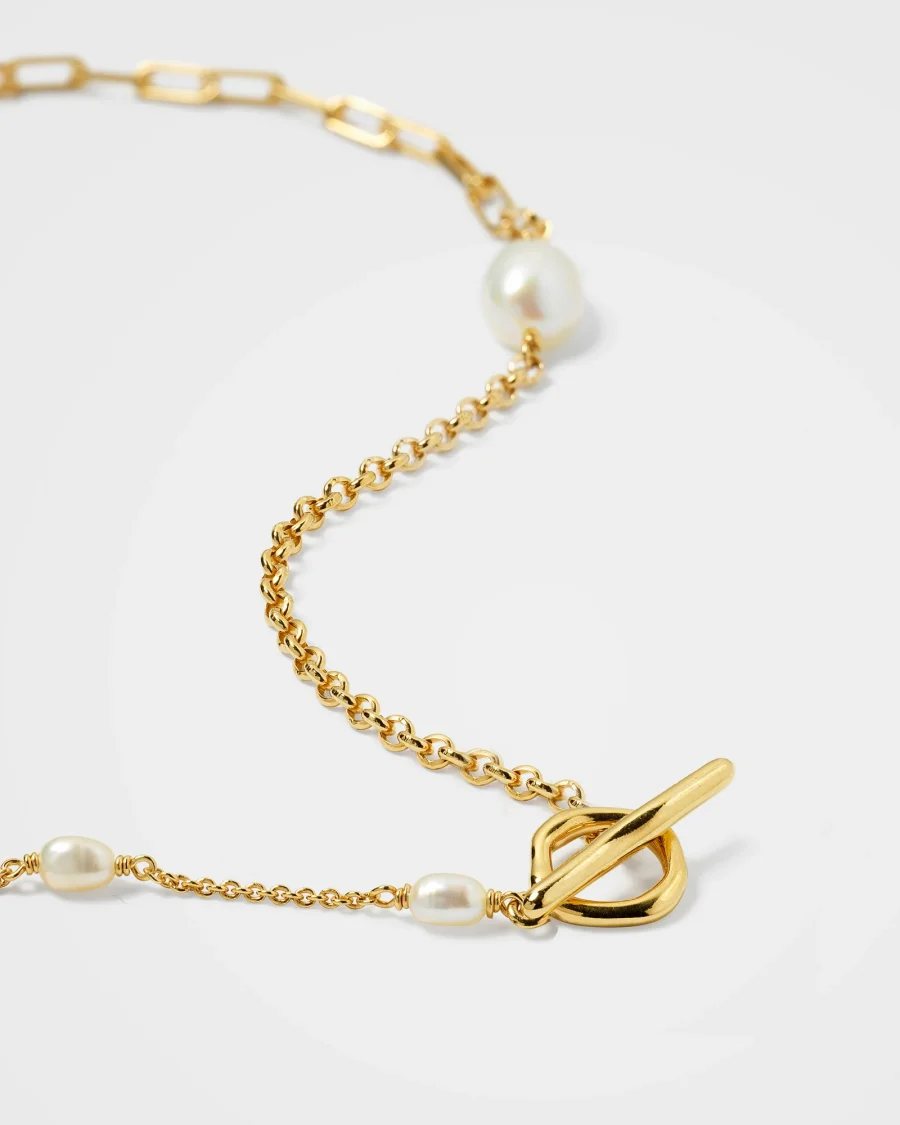 Halsband med tre olika typer av länkar, tillverkat i 100% återvunnet sterlingsilver, pläterat med 18K guld. Halsbandet har unika sötvattenpärlor och ett hamrat lås som blir en fin detalj.