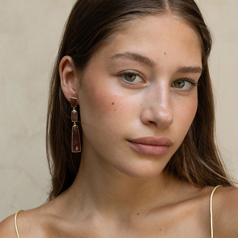 Tota-örhängena med smoky topaz har ett elegant och djupt uttryck. Den rökfärgade stenen möter förgylld mässing i en balanserad design som ger både lyster och karaktär.