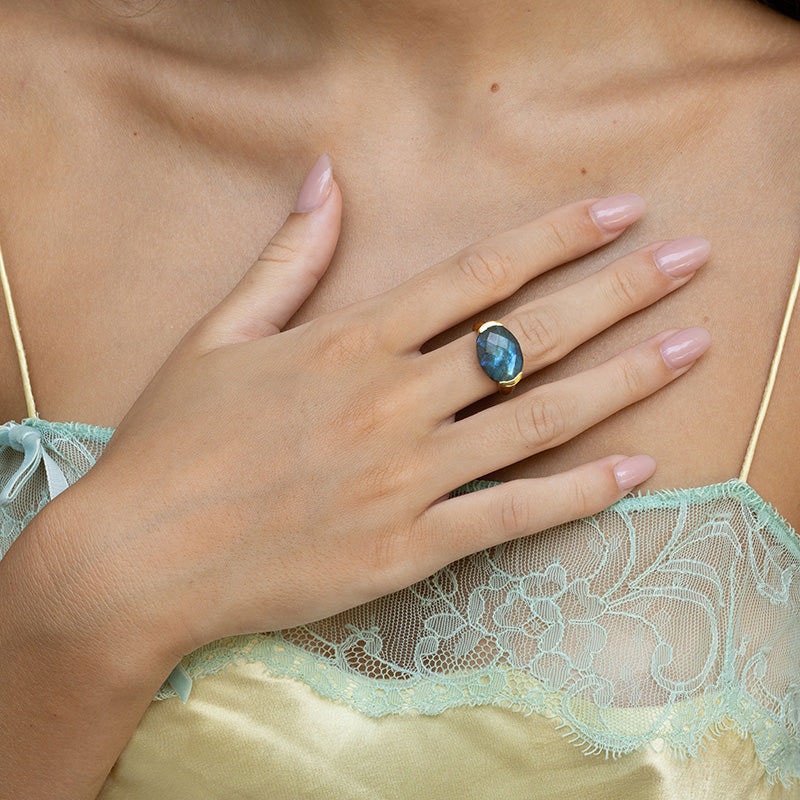 Den skimrande labradoriten står i fokus i denna version av Ashni. Stenens levande färgskiftningar möter den organiska formen i förgylld mässing och skapar ett mystiskt men elegant uttryck.